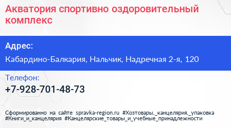 Акватория, спортивно-оздоровительный комплекс по адресу Кабардино-Балкария, Нальчик, Надречная 2-я, 120 в дальнейшем Организация, размещена в следующих категориях: