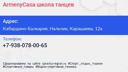 ArmenyCasa, школа танцев по адресу Кабардино-Балкария, Нальчик, Карашаева, 12а в дальнейшем Организация, размещена в следующих категориях: