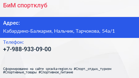 БиМ, спортклуб по адресу Кабардино-Балкария, Нальчик, Тарчокова, 54а/1 в дальнейшем Организация, размещена в следующих категориях: