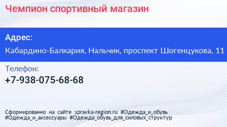 Чемпион, спортивный магазин по адресу Кабардино-Балкария, Нальчик, проспект Шогенцукова, 11 в дальнейшем Организация, размещена в следующих категориях: