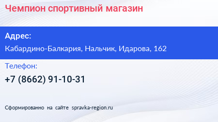 Чемпион, спортивный магазин по адресу Кабардино-Балкария, Нальчик, Идарова, 162 в дальнейшем Организация, размещена в следующих категориях: