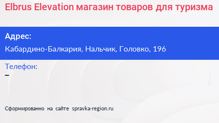 Elbrus Elevation, магазин товаров для туризма по адресу Кабардино-Балкария, Нальчик, Головко, 196 в дальнейшем Организация, размещена в следующих категориях: