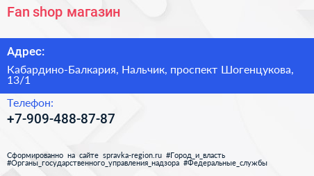 Fan shop, магазин по адресу Кабардино-Балкария, Нальчик, проспект Шогенцукова, 13/1 в дальнейшем Организация, размещена в следующих категориях: