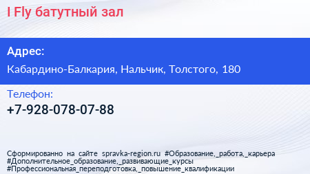 I-Fly, батутный зал по адресу Кабардино-Балкария, Нальчик, Толстого, 180 в дальнейшем Организация, размещена в следующих категориях: