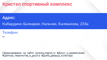 Кристал, спортивный комплекс по адресу Кабардино-Балкария, Нальчик, Калмыкова, 233а в дальнейшем Организация, размещена в следующих категориях: