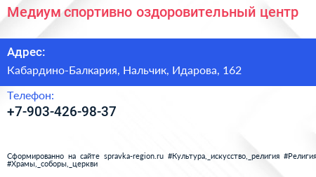 Медиум, спортивно-оздоровительный центр по адресу Кабардино-Балкария, Нальчик, Идарова, 162 в дальнейшем Организация, размещена в следующих категориях: