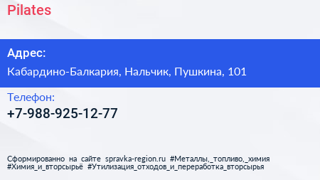 Pilates по адресу Кабардино-Балкария, Нальчик, Пушкина, 101 в дальнейшем Организация, размещена в следующих категориях: