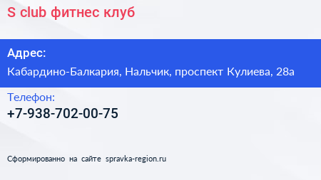 S club, фитнес-клуб по адресу Кабардино-Балкария, Нальчик, проспект Кулиева, 28а в дальнейшем Организация, размещена в следующих категориях: