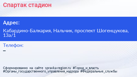 Спартак, стадион по адресу Кабардино-Балкария, Нальчик, проспект Шогенцукова, 13а/1 в дальнейшем Организация, размещена в следующих категориях: