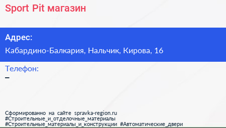 Sport Pit, магазин по адресу Кабардино-Балкария, Нальчик, Кирова, 16 в дальнейшем Организация, размещена в следующих категориях: