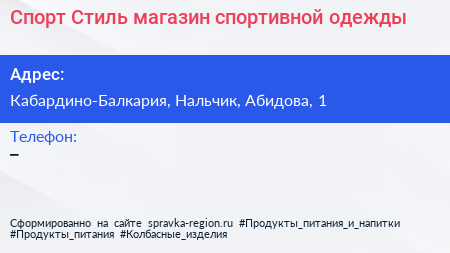 Спорт-Стиль, магазин спортивной одежды по адресу Кабардино-Балкария, Нальчик, Абидова, 1 в дальнейшем Организация, размещена в следующих категориях: