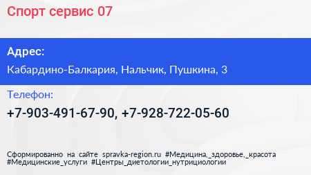 Спорт-сервис 07 по адресу Кабардино-Балкария, Нальчик, Пушкина, 3 в дальнейшем Организация, размещена в следующих категориях: