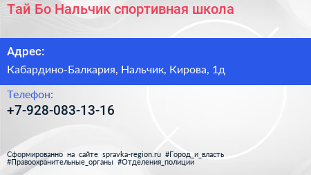 Тай-Бо Нальчик, спортивная школа по адресу Кабардино-Балкария, Нальчик, Кирова, 1д в дальнейшем Организация, размещена в следующих категориях: