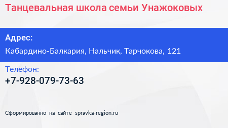 Танцевальная школа семьи Унажоковых по адресу Кабардино-Балкария, Нальчик, Тарчокова, 121 в дальнейшем Организация, размещена в следующих категориях:
