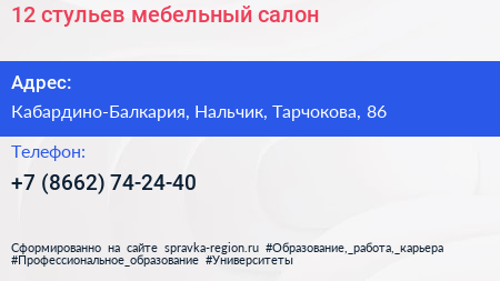 12 стульев, мебельный салон по адресу Кабардино-Балкария, Нальчик, Тарчокова, 86 в дальнейшем Организация, размещена в следующих категориях:
