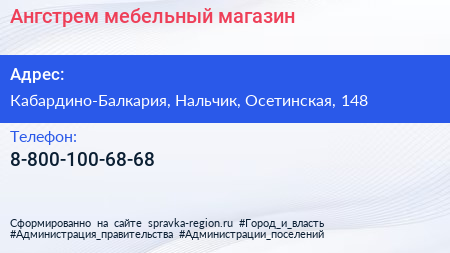 Ангстрем, мебельный магазин по адресу Кабардино-Балкария, Нальчик, Осетинская, 148 в дальнейшем Организация, размещена в следующих категориях: