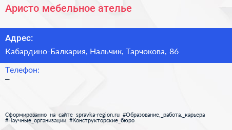 Аристо, мебельное ателье по адресу Кабардино-Балкария, Нальчик, Тарчокова, 86 в дальнейшем Организация, размещена в следующих категориях:
