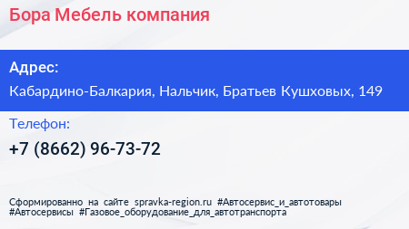 Бора-Мебель, компания по адресу Кабардино-Балкария, Нальчик, Братьев Кушховых, 149 в дальнейшем Организация, размещена в следующих категориях: