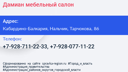 Дамиан, мебельный салон по адресу Кабардино-Балкария, Нальчик, Тарчокова, 86 в дальнейшем Организация, размещена в следующих категориях: