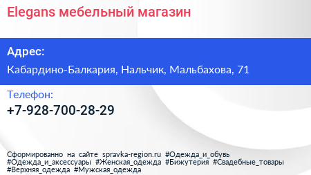 Elegans, мебельный магазин по адресу Кабардино-Балкария, Нальчик, Мальбахова, 71 в дальнейшем Организация, размещена в следующих категориях: