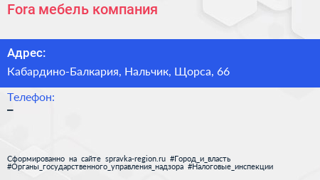 Fora мебель, компания по адресу Кабардино-Балкария, Нальчик, Щорса, 66 в дальнейшем Организация, размещена в следующих категориях: