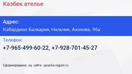 Казбек, ателье по адресу Кабардино-Балкария, Нальчик, Ахохова, 96а в дальнейшем Организация, размещена в следующих категориях:
