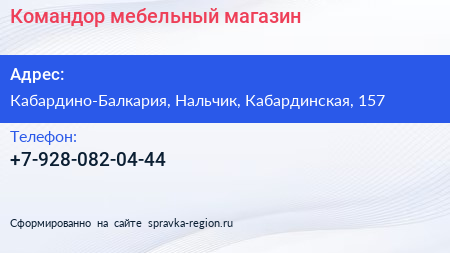 Командор, мебельный магазин по адресу Кабардино-Балкария, Нальчик, Кабардинская, 157 в дальнейшем Организация, размещена в следующих категориях: