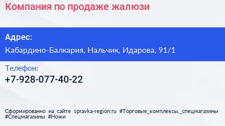 Компания по продаже жалюзи по адресу Кабардино-Балкария, Нальчик, Идарова, 91/1 в дальнейшем Организация, размещена в следующих категориях: