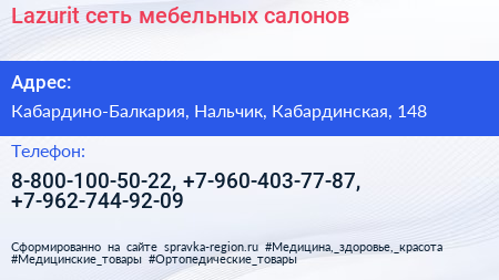 Lazurit, сеть мебельных салонов по адресу Кабардино-Балкария, Нальчик, Кабардинская, 148 в дальнейшем Организация, размещена в следующих категориях: