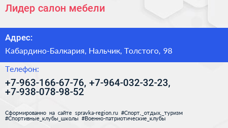 Лидер, салон мебели по адресу Кабардино-Балкария, Нальчик, Толстого, 98 в дальнейшем Организация, размещена в следующих категориях: