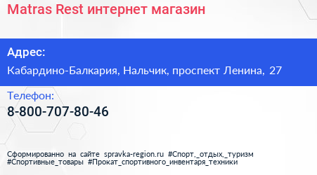 Matras Rest, интернет-магазин по адресу Кабардино-Балкария, Нальчик, проспект Ленина, 27 в дальнейшем Организация, размещена в следующих категориях: