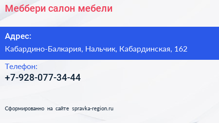 Меббери, салон мебели по адресу Кабардино-Балкария, Нальчик, Кабардинская, 162 в дальнейшем Организация, размещена в следующих категориях: