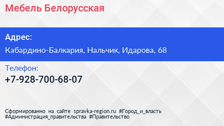 Мебель Белорусская по адресу Кабардино-Балкария, Нальчик, Идарова, 68 в дальнейшем Организация, размещена в следующих категориях: