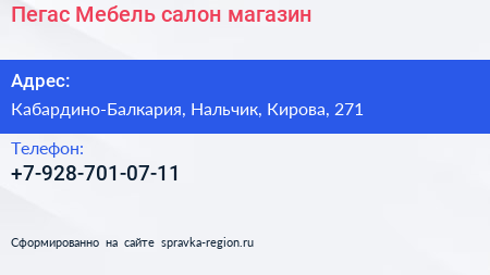 Пегас-Мебель, салон-магазин по адресу Кабардино-Балкария, Нальчик, Кирова, 271 в дальнейшем Организация, размещена в следующих категориях:
