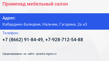 Променад, мебельный салон по адресу Кабардино-Балкария, Нальчик, Гагарина, 2а к3 в дальнейшем Организация, размещена в следующих категориях: