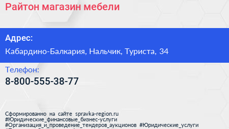Райтон, магазин мебели по адресу Кабардино-Балкария, Нальчик, Туриста, 34 в дальнейшем Организация, размещена в следующих категориях: