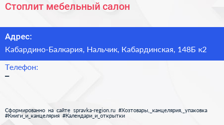 Стоплит, мебельный салон по адресу Кабардино-Балкария, Нальчик, Кабардинская, 148Б к2 в дальнейшем Организация, размещена в следующих категориях: