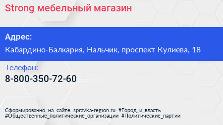 Strong, мебельный магазин по адресу Кабардино-Балкария, Нальчик, проспект Кулиева, 18 в дальнейшем Организация, размещена в следующих категориях: