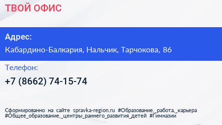 ТВОЙ ОФИС по адресу Кабардино-Балкария, Нальчик, Тарчокова, 86 в дальнейшем Организация, размещена в следующих категориях: