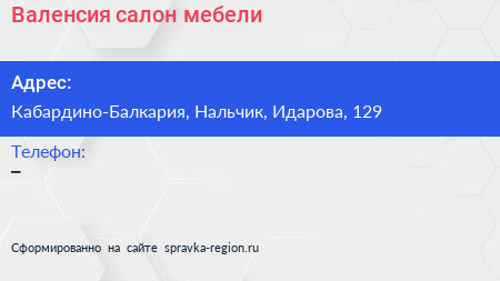 Валенсия, салон мебели по адресу Кабардино-Балкария, Нальчик, Идарова, 129 в дальнейшем Организация, размещена в следующих категориях: