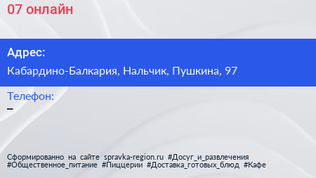 07 онлайн по адресу Кабардино-Балкария, Нальчик, Пушкина, 97 в дальнейшем Организация, размещена в следующих категориях: