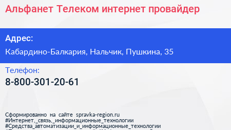 Альфанет Телеком, интернет-провайдер по адресу Кабардино-Балкария, Нальчик, Пушкина, 35 в дальнейшем Организация, размещена в следующих категориях: