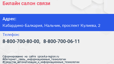 Билайн, салон связи по адресу Кабардино-Балкария, Нальчик, проспект Кулиева, 2 в дальнейшем Организация, размещена в следующих категориях:
