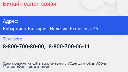Билайн, салон связи по адресу Кабардино-Балкария, Нальчик, Кешокова, 45 в дальнейшем Организация, размещена в следующих категориях: