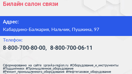 Билайн, салон связи по адресу Кабардино-Балкария, Нальчик, Пушкина, 97 в дальнейшем Организация, размещена в следующих категориях: