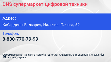 DNS, супермаркет цифровой техники по адресу Кабардино-Балкария, Нальчик, Пачева, 52 в дальнейшем Организация, размещена в следующих категориях: