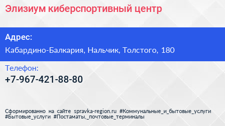 Элизиум, киберспортивный центр по адресу Кабардино-Балкария, Нальчик, Толстого, 180 в дальнейшем Организация, размещена в следующих категориях: