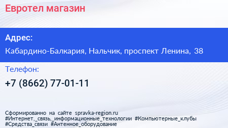 Евротел, магазин по адресу Кабардино-Балкария, Нальчик, проспект Ленина, 38 в дальнейшем Организация, размещена в следующих категориях: