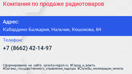 Компания по продаже радиотоваров по адресу Кабардино-Балкария, Нальчик, Кешокова, 84 в дальнейшем Организация, размещена в следующих категориях: