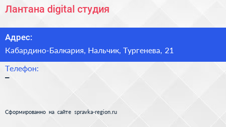 Лантана, digital-студия по адресу Кабардино-Балкария, Нальчик, Тургенева, 21 в дальнейшем Организация, размещена в следующих категориях: